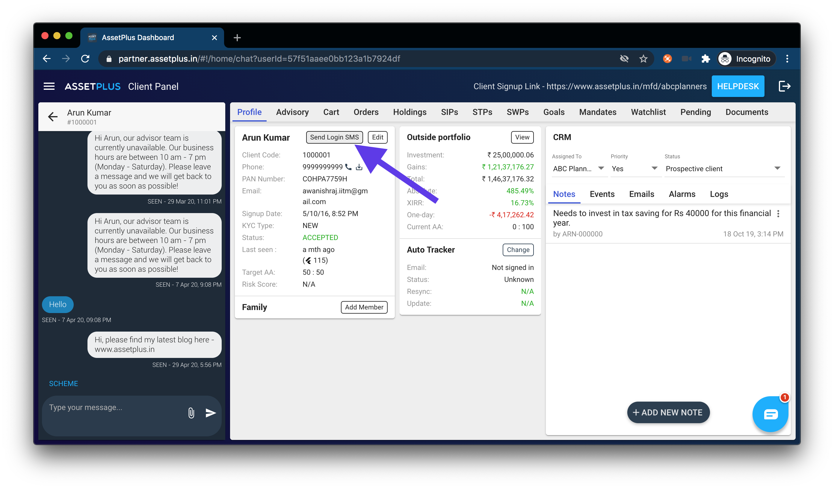 - "Send Login SMS" button to send the app link to the client via SMS.