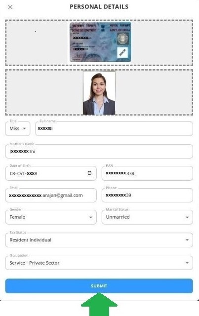 a) Personal details: The personal details of the client such as Name, Date of Birth, PAN number, Email ID, Phone number, Gender, Mother's Name, Marital Status, Tax Status, and Occupation needs to be entered. Also, an ID proof such as a PAN card and a Passport size photo needs to be uploaded for processing. The image size should be less than 2MB. Once the details are entered, the client needs to verify and click on Submit.