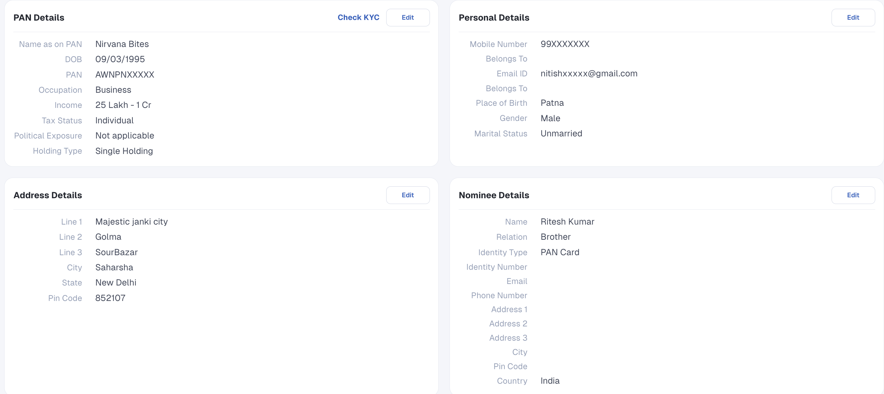 The PAN of a Sole Proprietor is the same as their Individual PAN. Kindly note that if the PAN is registered under a Sole Proprietorship account, the client cannot simultaneously use the same PAN to invest as an Individual.