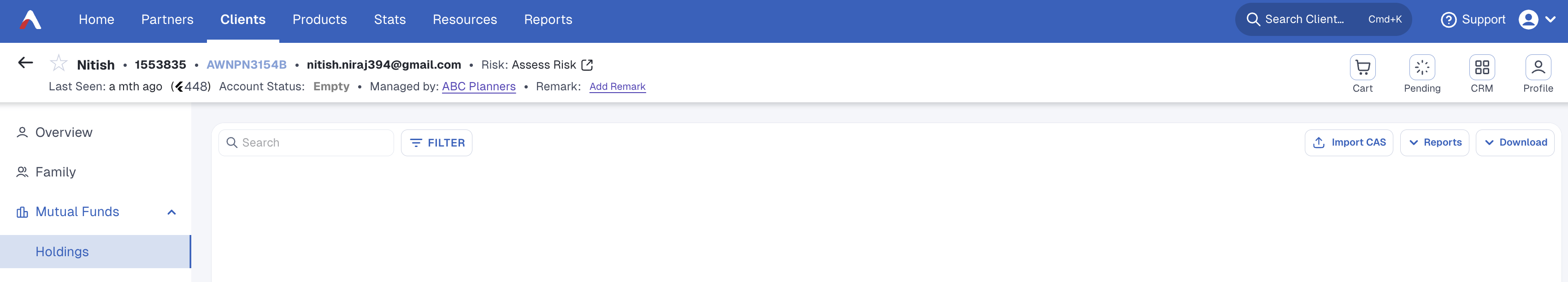 Go to the dashboard, select the client for whom you want to track external funds, and click on Mutual Funds -> Holdings -> Import CAS.