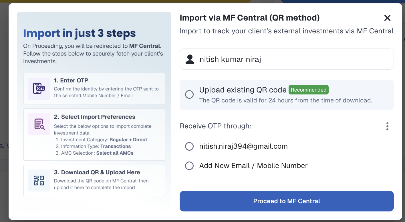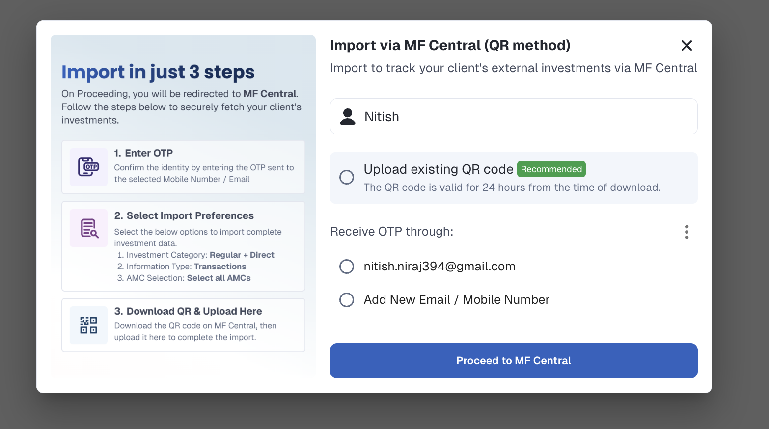 Select your client's registered email ID or add a new email ID/Mobile number for which you want to import external investments.